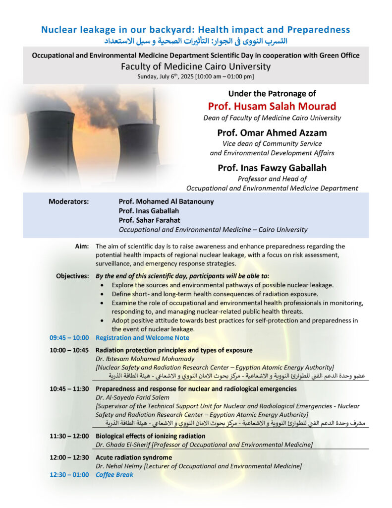 يشرفنا دعوتكم جميعا لحضور اليوم العلمي لقسم الطب المهني والبيئي بالتعاون مع المكتب الاخضر الأحد 6 يوليو بمركز المؤتمرات قاعه B للتعرف على التداعيات المحتملة في حالة حدوث التسرب النووي…