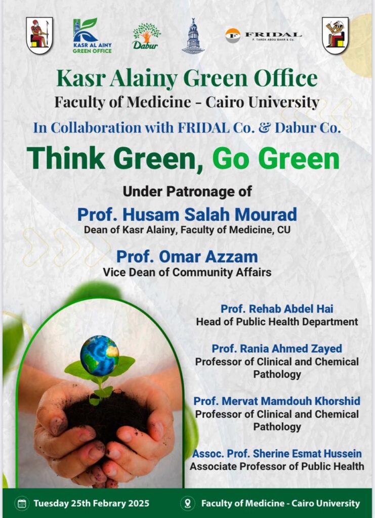 The event was held under the patronage of Professor Hussam Salah, Dean of the Faculty of Medicine, Kasr Al-Ainy, Chairman of the Hospitals Board of Directors, and Head of the Green Office, and under the supervision of Professor Omar Azam, Vice Dean for Community Service and Environmental Development, and Deputy Head of the Green OfficeProfessor Rehab Abdel-Hai, Head of the Department of Public Health.